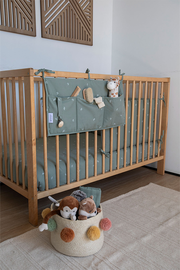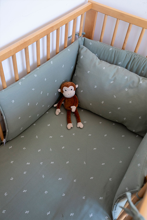 The classic cot bumper gloop! protects the bed head and half of two sides. Put your baby in safety during sleep by protecting him from the bed rails. The outside is made with our 100% organic cotton certified and the filling is polyester. Size: 190x35cm