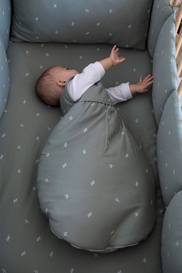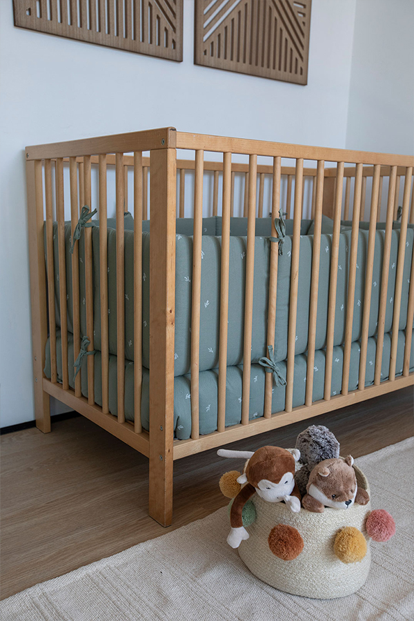 The complet cot bumper gloop! protects all around the bed. Put the baby in safety during sleep, protecting him. The outside is made with our 100% organic cotton certified and the filling is polyester. Size: 360x30cm