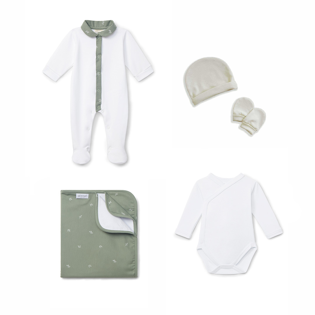 Le set gloop! nouveau-né est parfait pour les premiers jours de bébé. Le set Premiers Vêtements comprend Grenouillère 0 mois (50cm), Body 0 mois (30cm), Bonnet, Gant et Couverture-Plaid 0-3 mois. Fabriqué au Portugal.