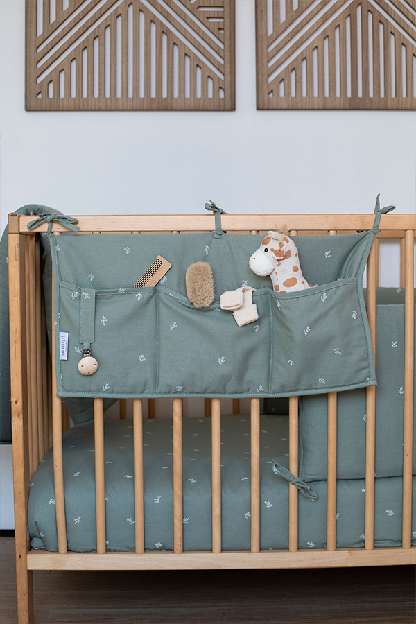 Fabricado com tecido 100% algodão biológico certificado, suave e seguro para o ambiente do bebé. Tiras ajustáveis que permitem fixá-lo facilmente em qualquer tipo de berço ou parede.