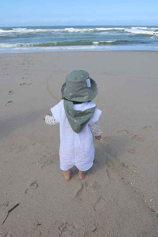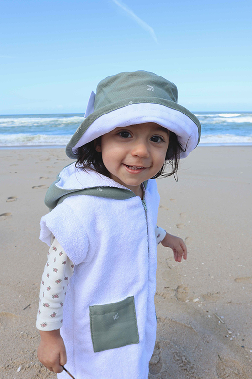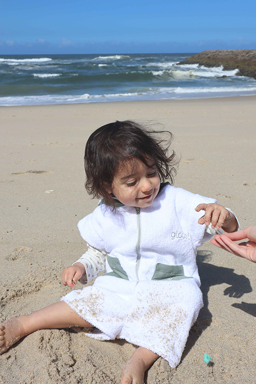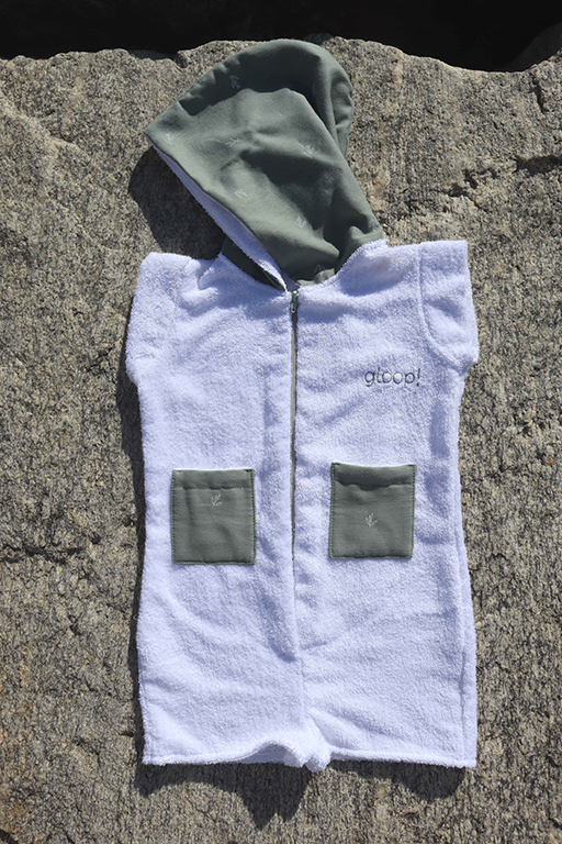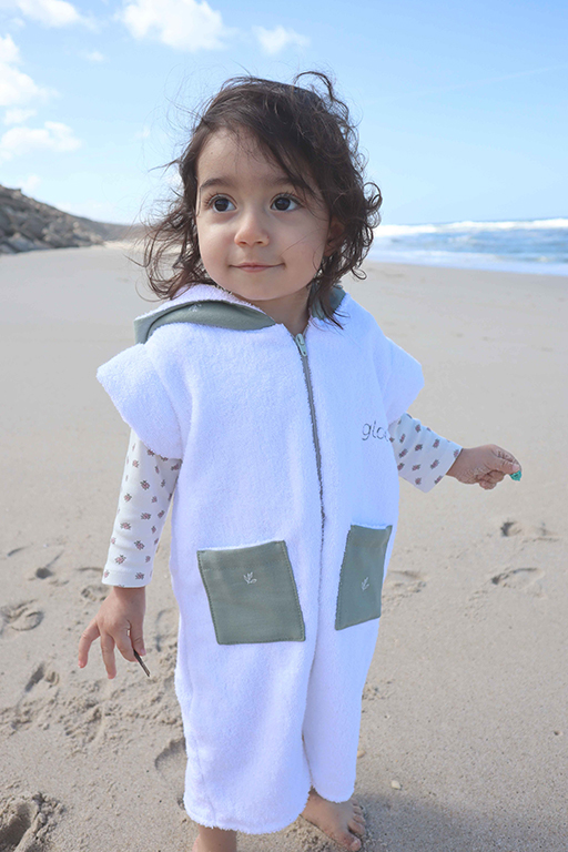 Macacão de praia curta em 100% algodão orgânico com carapuço para bebés e crianças até aos 7 anos. Macacão de manga e perna curta feito em tecido turco absorvente, é fácil de vestir graças ao fecho éclair na frente. Possui um carapuço que ajuda a secar rapidamente o cabelo e a manter o bebé/criança aconchegado na praia.